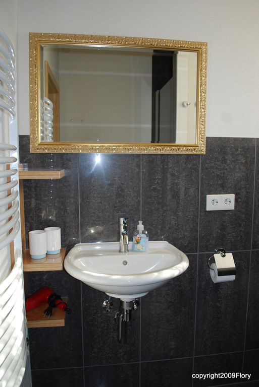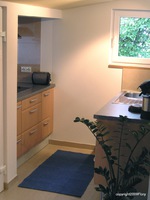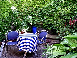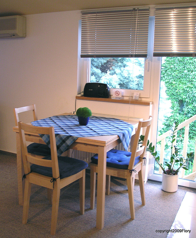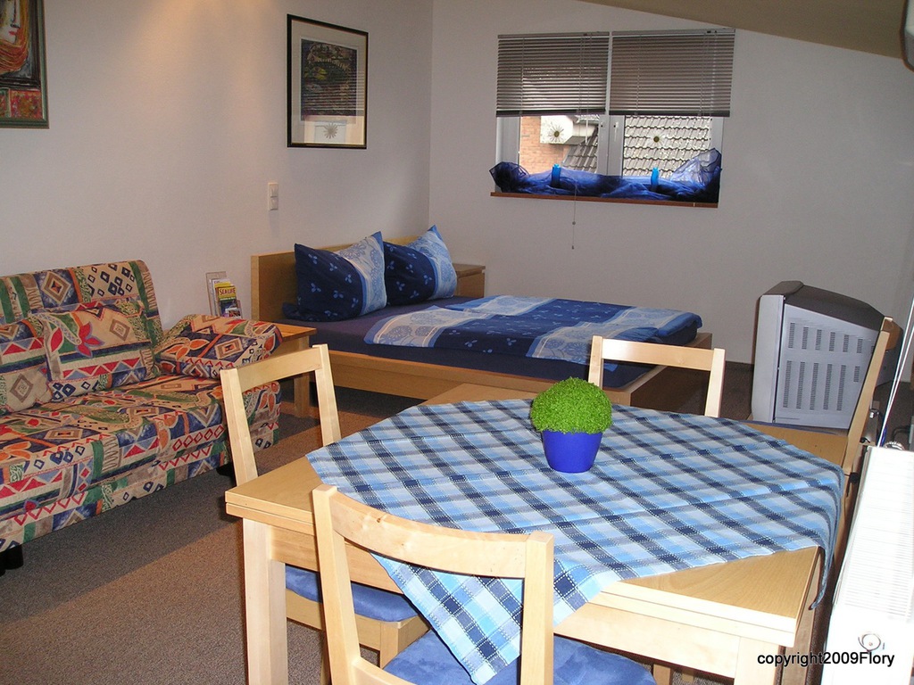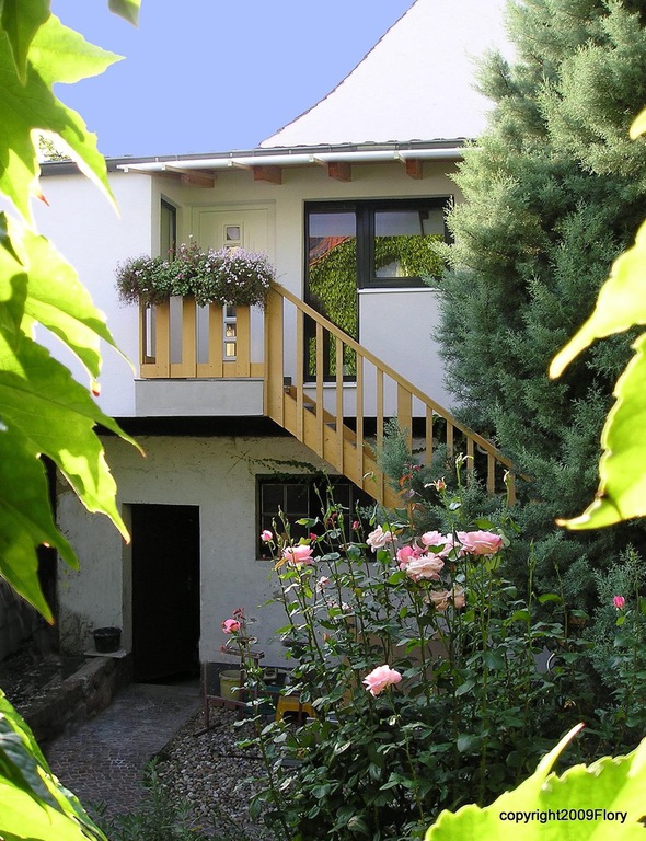 Unser kleines Apartment liegt im ersten Stock und bietet einen wunderbaren Ausblick in den Garten. Der namensgebende Hollunderbaum ist leider eingegangen. Die Wohnung